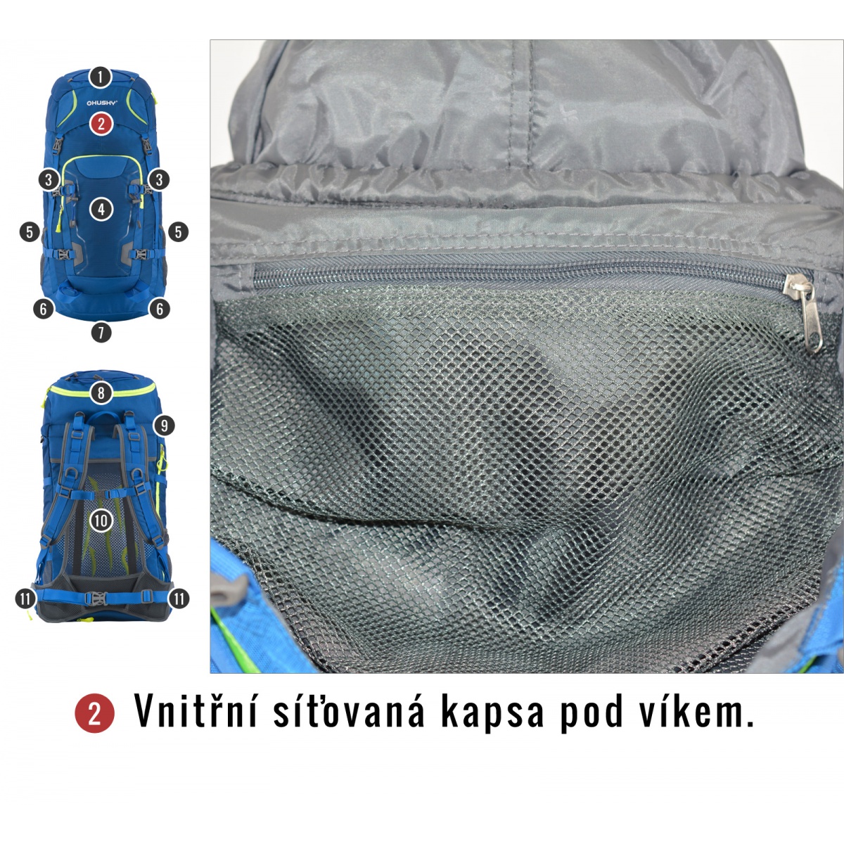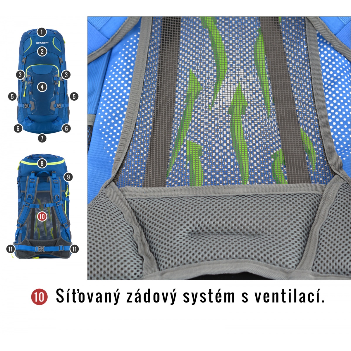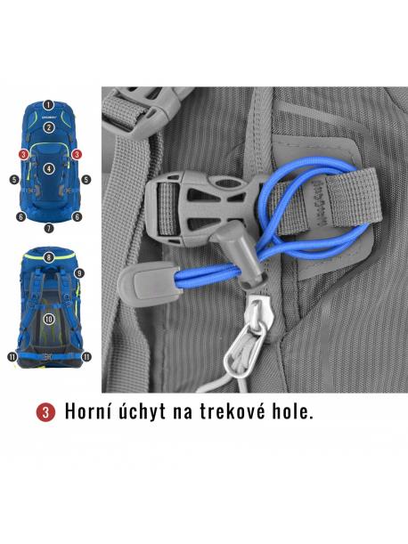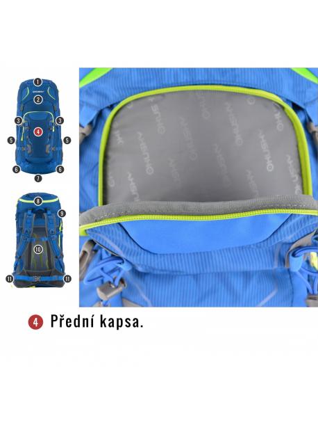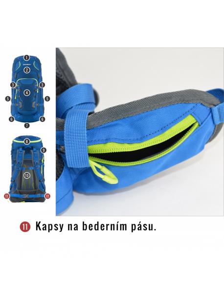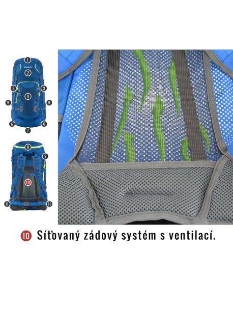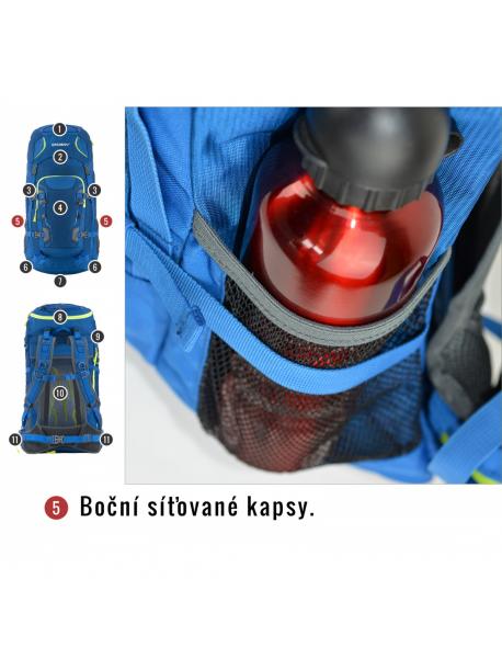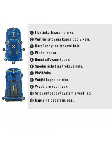 vybavení : zádový systém DAMR s duralovými výztuhami, prodyšné polstrování na anatomicky tvarovaných ramenních a bederních popruzích, 1 hlavní komora s přední kapsou a přidaným bočním vstupem, boční síťované kapsy, boční kompresní popruhy, hrudní a bederní popruh, nepromokavé zipy, úchyty na trekové hole či jinou výbavu, elastická fixace pro vybavení na víku, příprava pro vodní vak, pláštěnka, reflexní prvky.