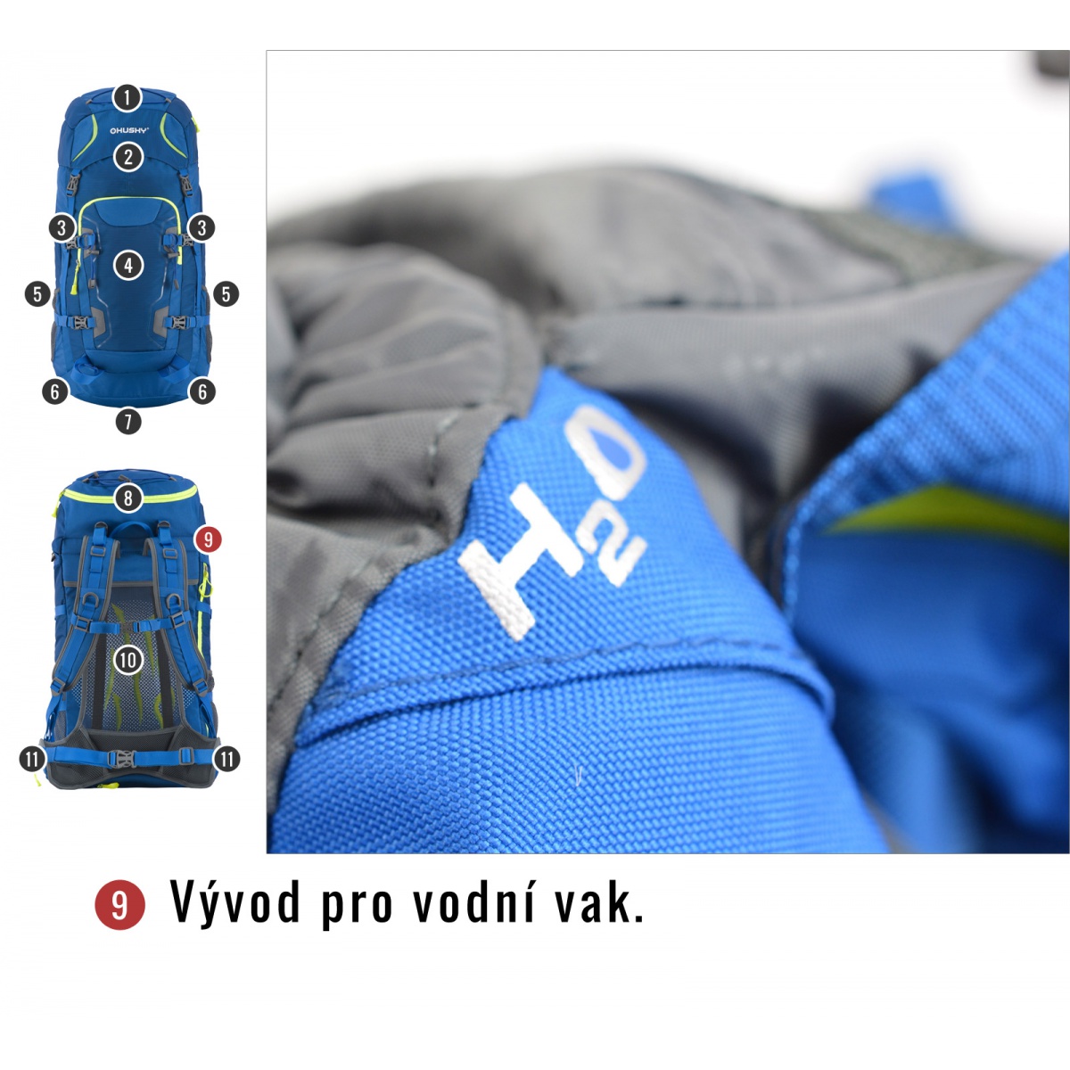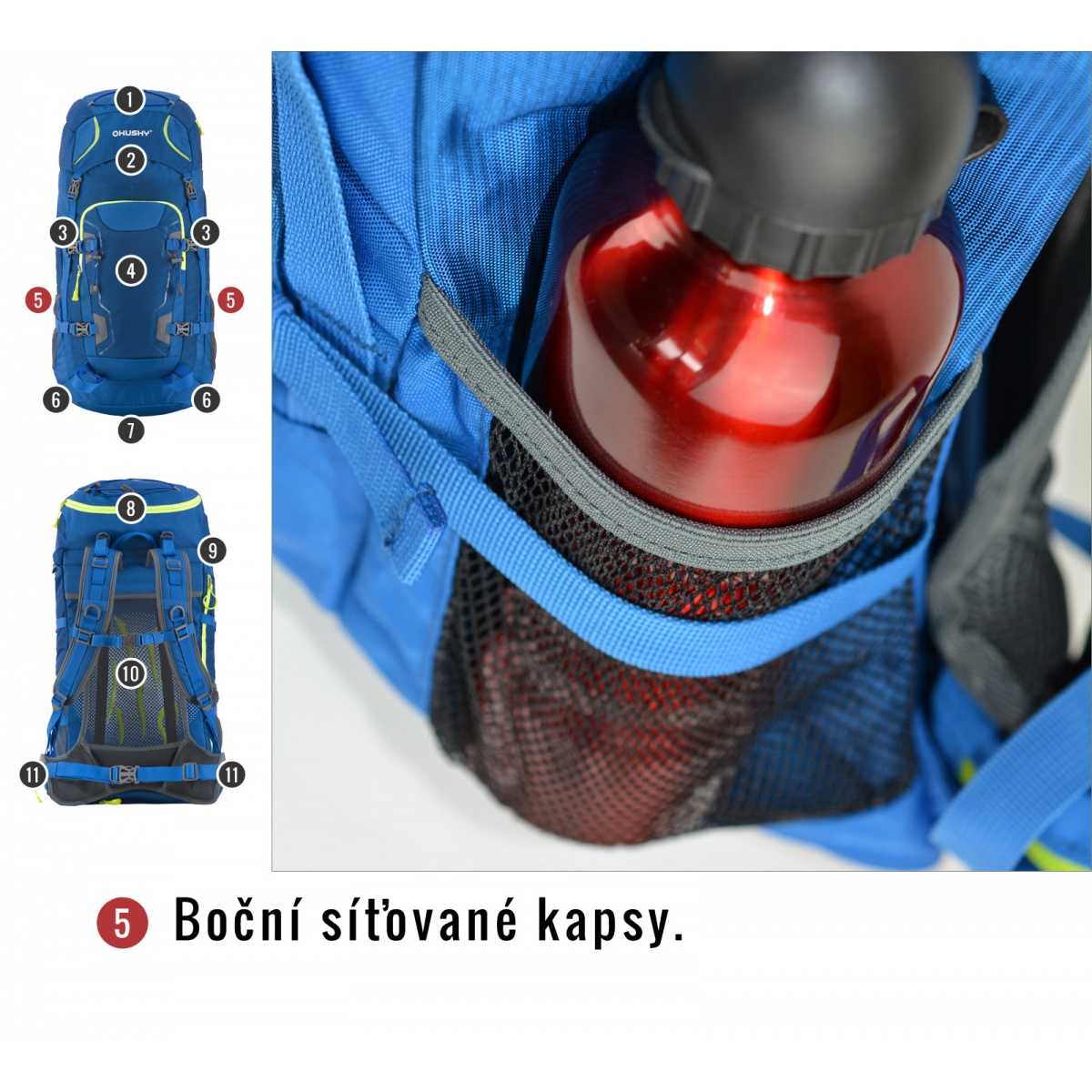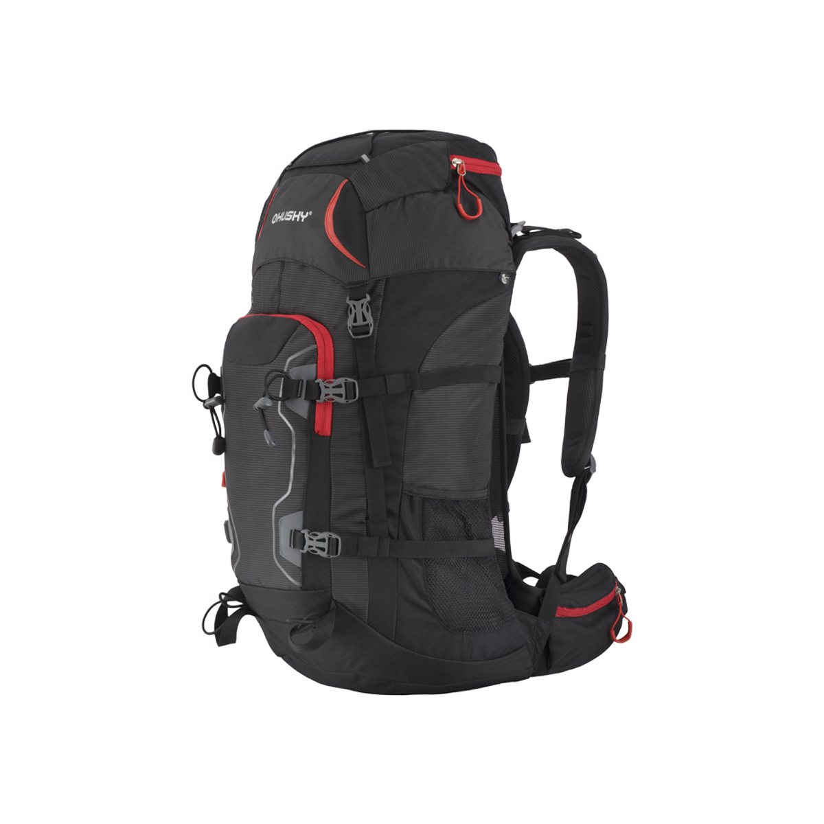 vybavení : zádový systém DAMR s duralovými výztuhami, prodyšné polstrování na anatomicky tvarovaných ramenních a bederních popruzích, 1 hlavní komora s přední kapsou a přidaným bočním vstupem, boční síťované kapsy, boční kompresní popruhy, hrudní a bederní popruh, nepromokavé zipy, úchyty na trekové hole či jinou výbavu, elastická fixace pro vybavení na víku, příprava pro vodní vak, pláštěnka, reflexní prvky.