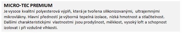 - další vybavení : dvouvrstvá konstrukce s prošitím, anatomický střih, uzavřená tvarovaná kapuce, jednou rukou ovladatelné stahování kapuce, vnitřní zateplovací límec, obousměrný zip s pojistkou proti samovolnému rozepínání, vyztužená léga , kapsa na mobil, kompresní obal